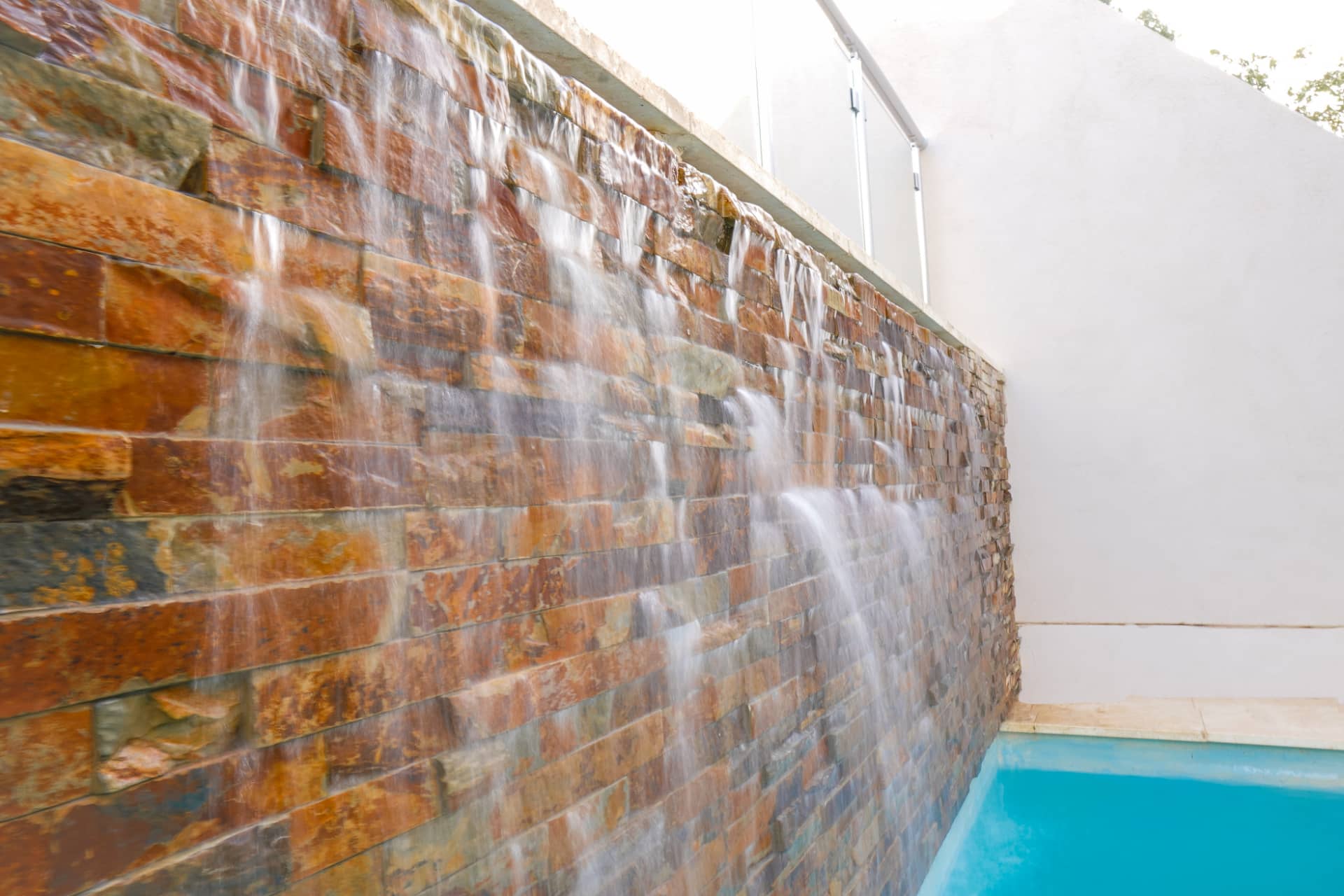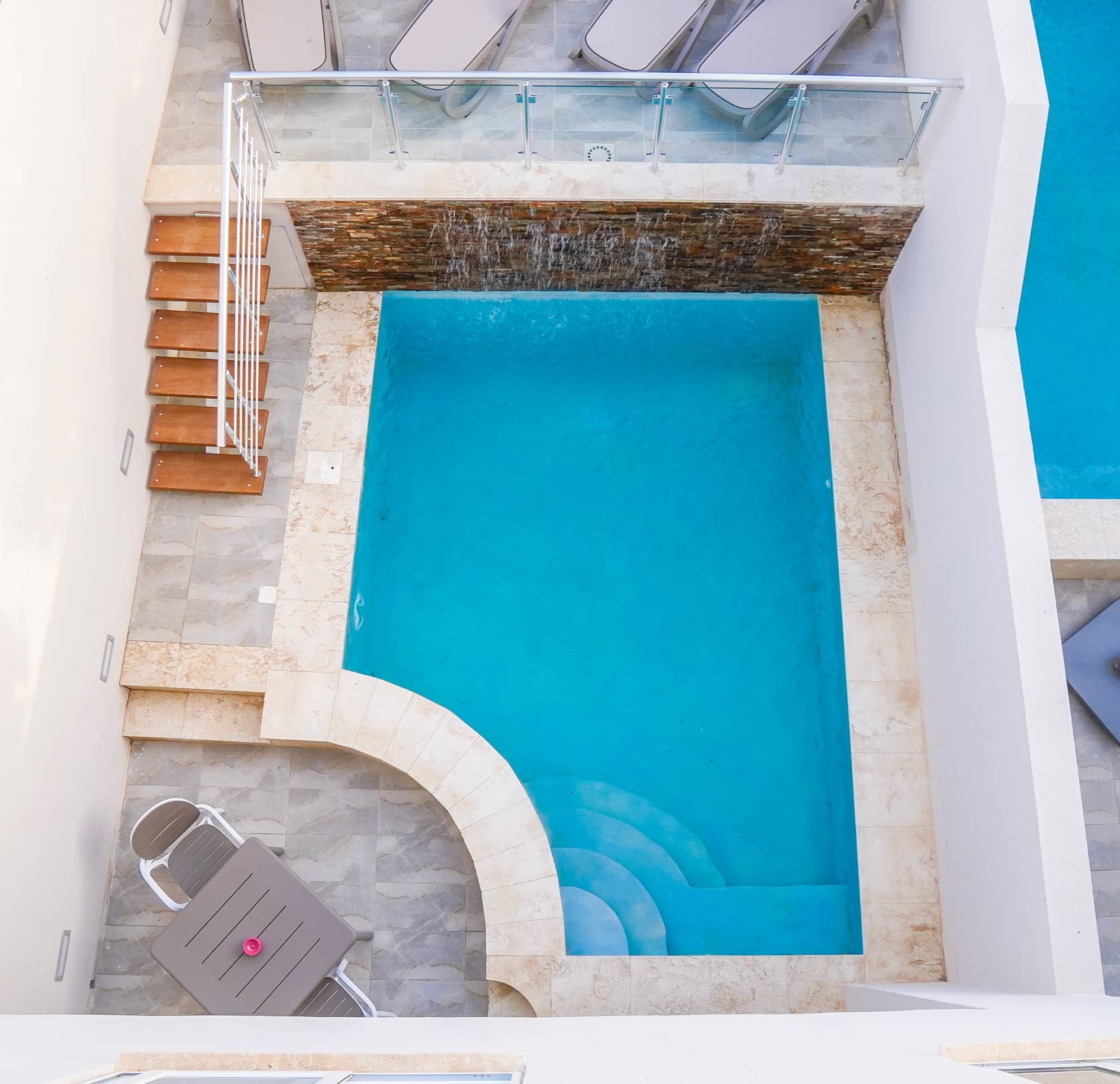 Our private pool area is complete with a water cascade, sun loungers, outdoor dining place and a BBQ area.